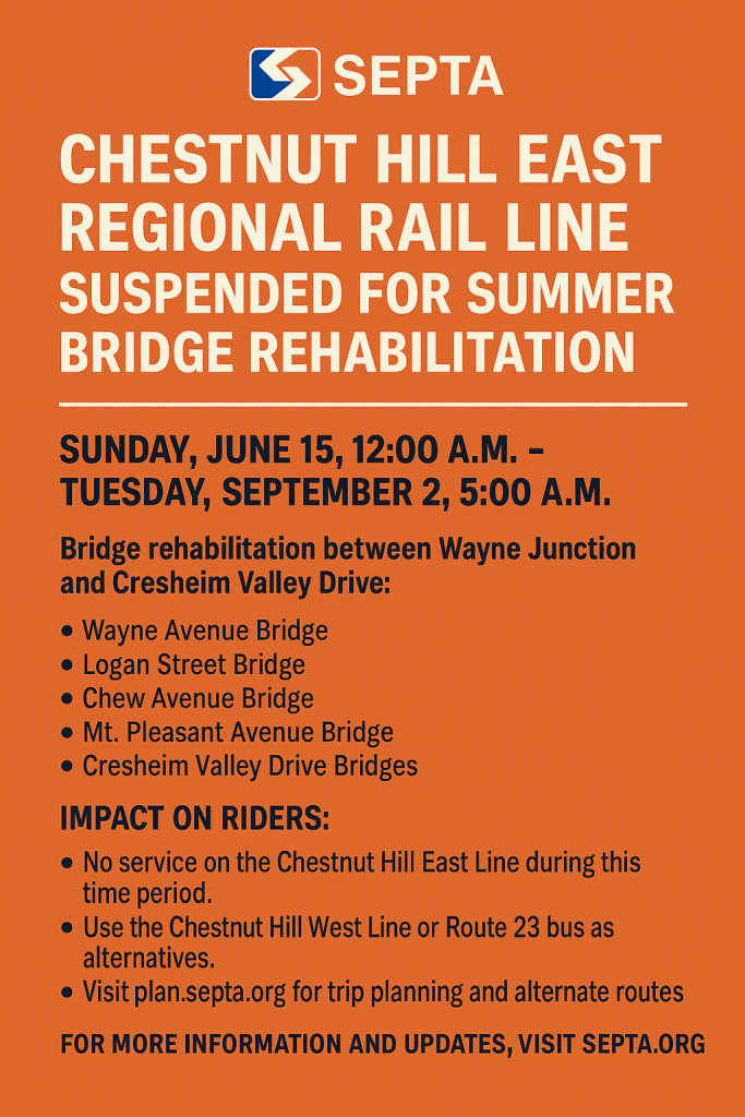 SEPTA will temporarily suspend service on the entire Chestnut Hill East Regional Rail Line from Sunday, June 15 at 12:00 a.m. through Tuesday, September 2 at 5:00 a.m. to complete a major bridge rehabilitation project.