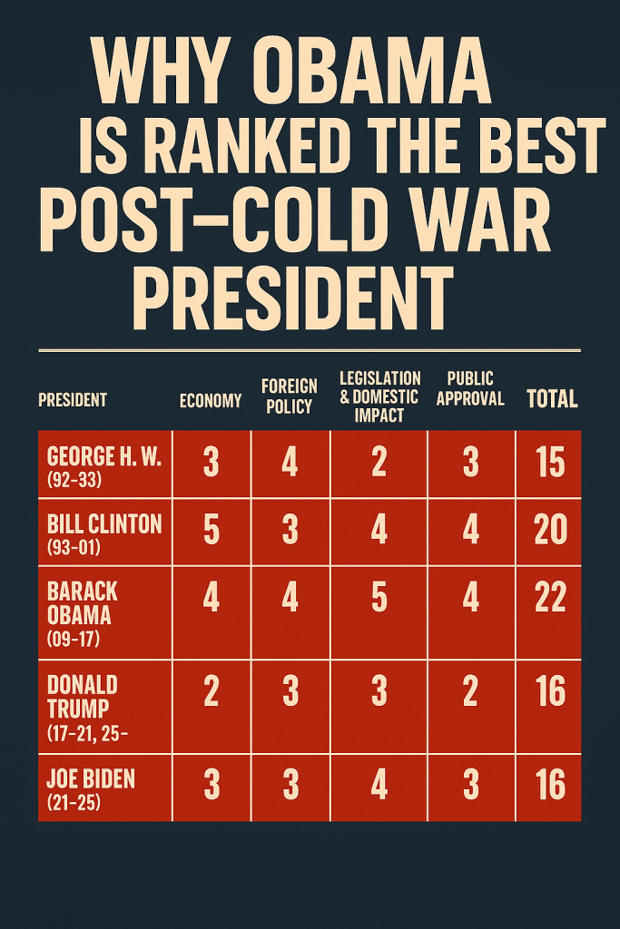 Since the Cold War ended, America has been led by six presidents navigating new global realities. When evaluated across economy, foreign policy, domestic legislation, public approval, and legacy potential, Barack Obama emerges at the top. But each president made lasting marks, for better or worse.