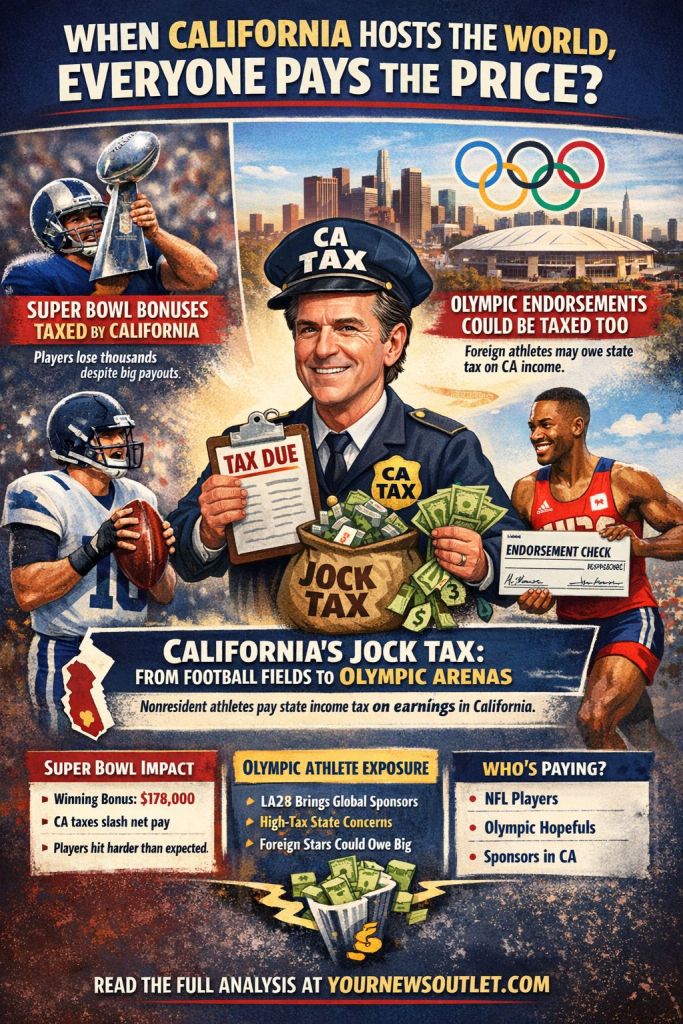 California’s jock tax has already reduced Super Bowl bonuses for NFL players competing in the state. The same rules—applied to endorsements, appearances, and promotional work—are positioned to affect Olympic athletes, including foreign competitors, during the 2028 Games. The Olympics do not provide a tax exemption. They simply shine a brighter light on a system California has enforced for decades, one duty day, one bonus, and one endorsement deal at a time.