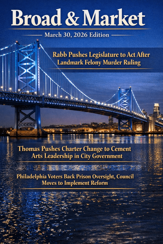 The March 30, 2026 edition of Broad & Market centers on accountability, reform, and investment in Philadelphia’s future. From Harrisburg, momentum builds as lawmakers respond to a landmark court ruling on felony murder sentencing. Locally, City Council advances efforts to permanently elevate arts and culture through charter reform, recognizing the creative economy as a key driver of growth.